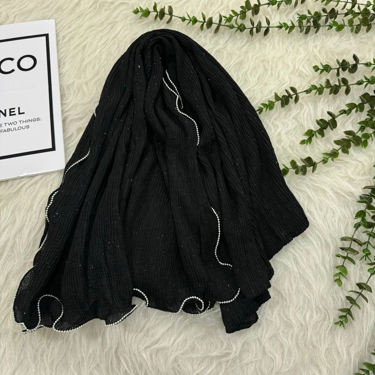 شال نخی مشکی براق دور مرواریدی زنانه قواره بزرگ 190x85 کد 943