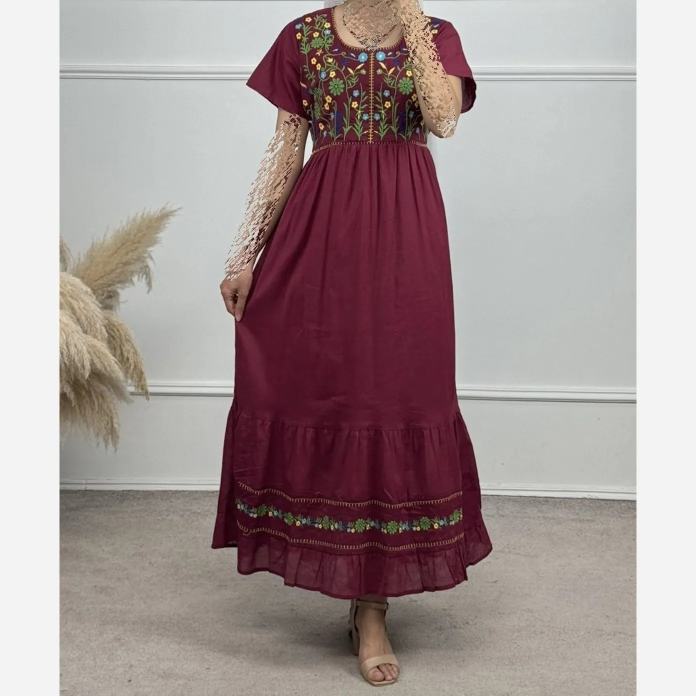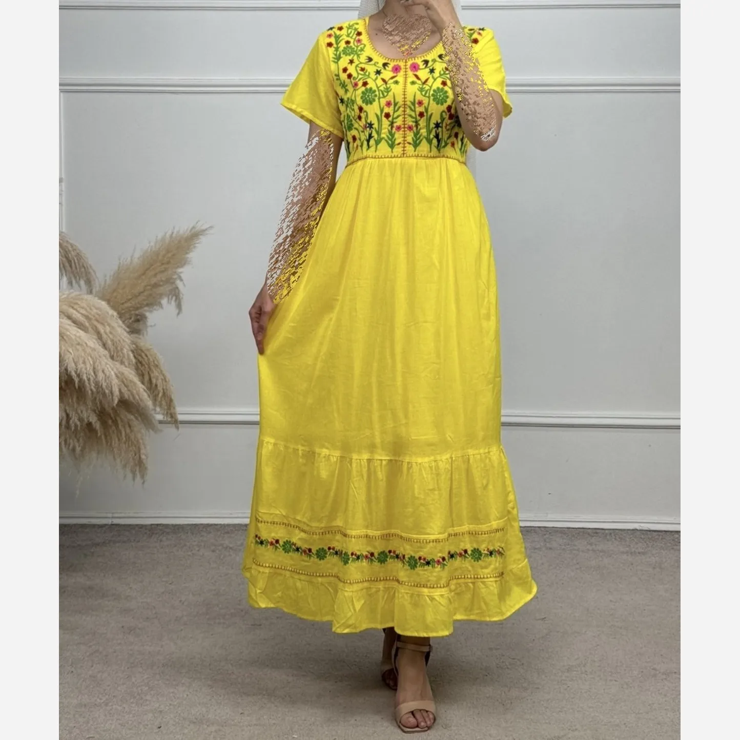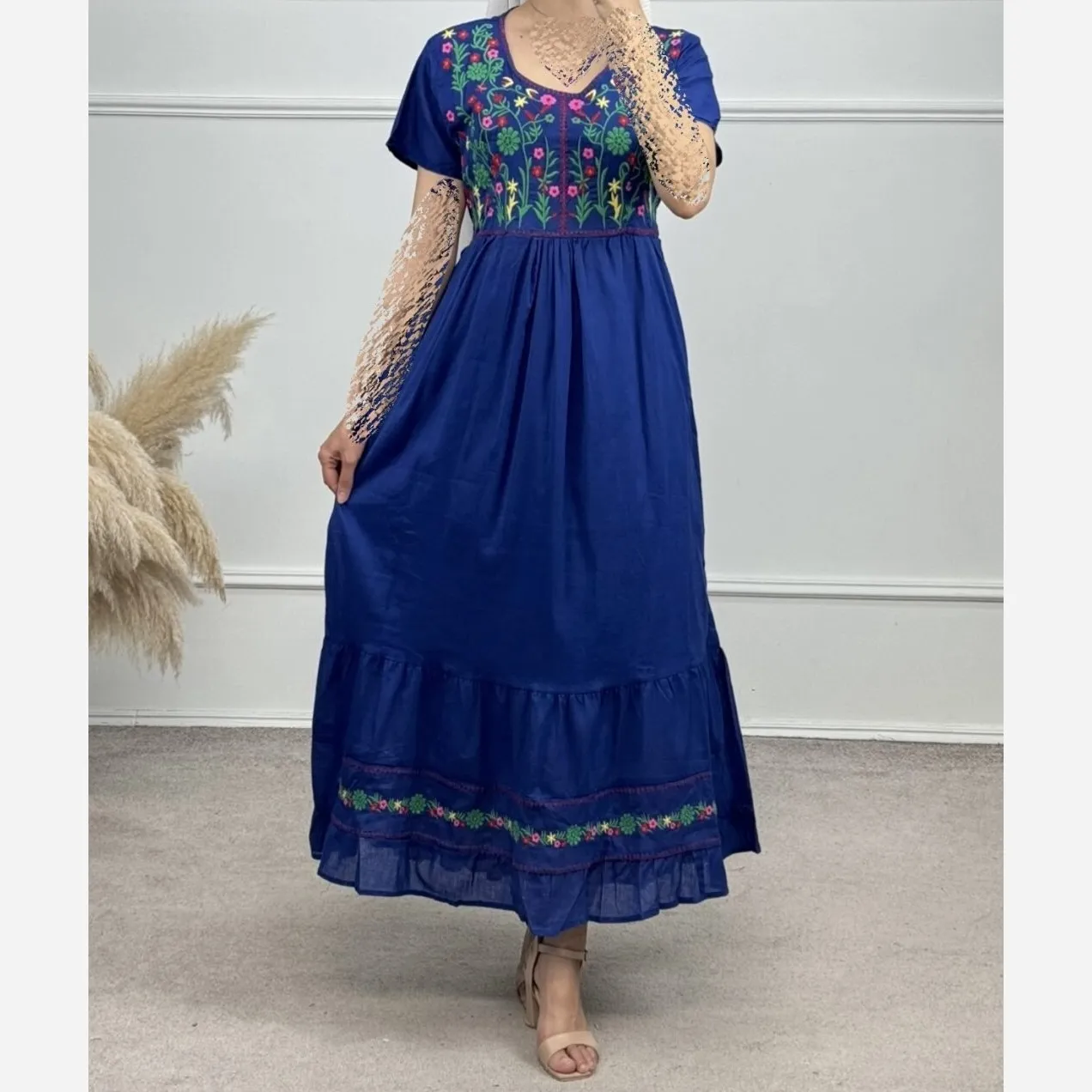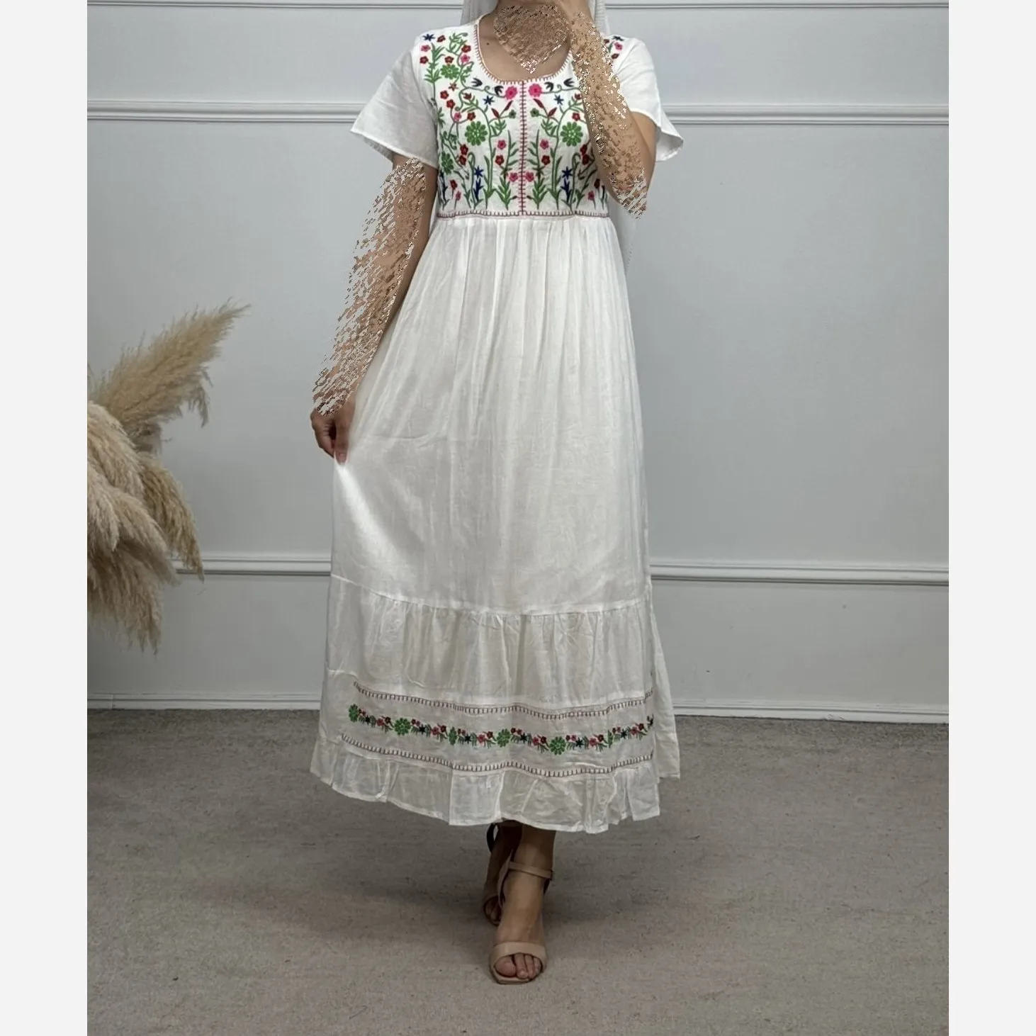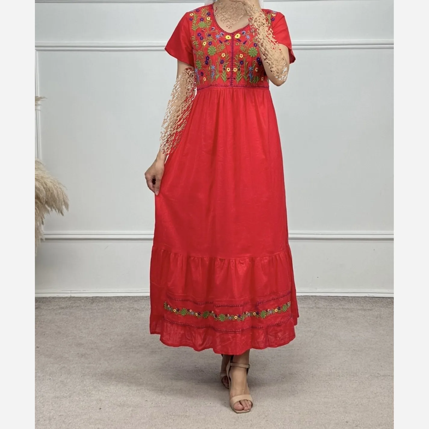 پیراهن ساحلی نخی گلدوزی شده زنانه فری سایز تا 48 آستردار کمربنددار 6 رنگ