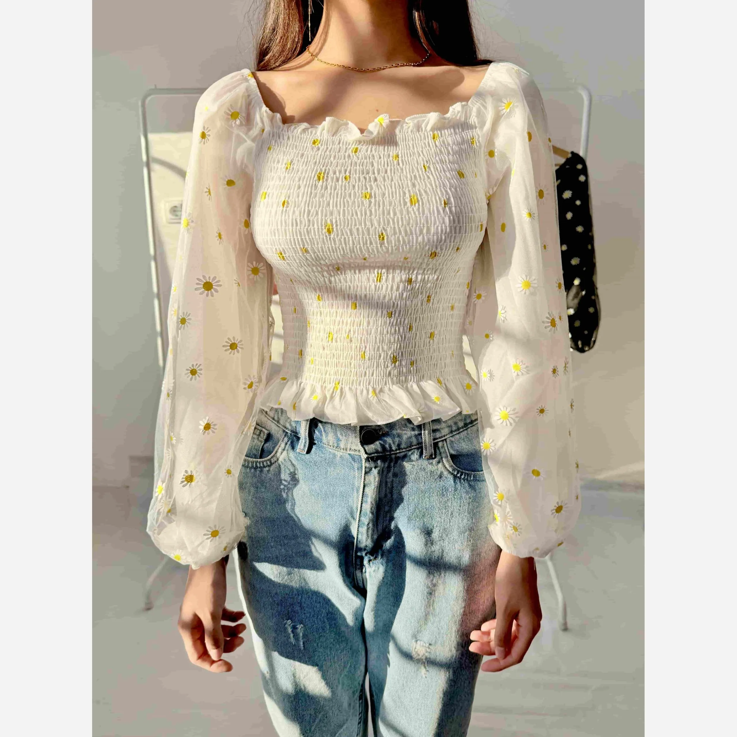 پیراهن کراپ بابونه نخ طوری فری سایز مناسب تا 38 تنخور شیک و راحت چهارفصل بدون سایه اندازی