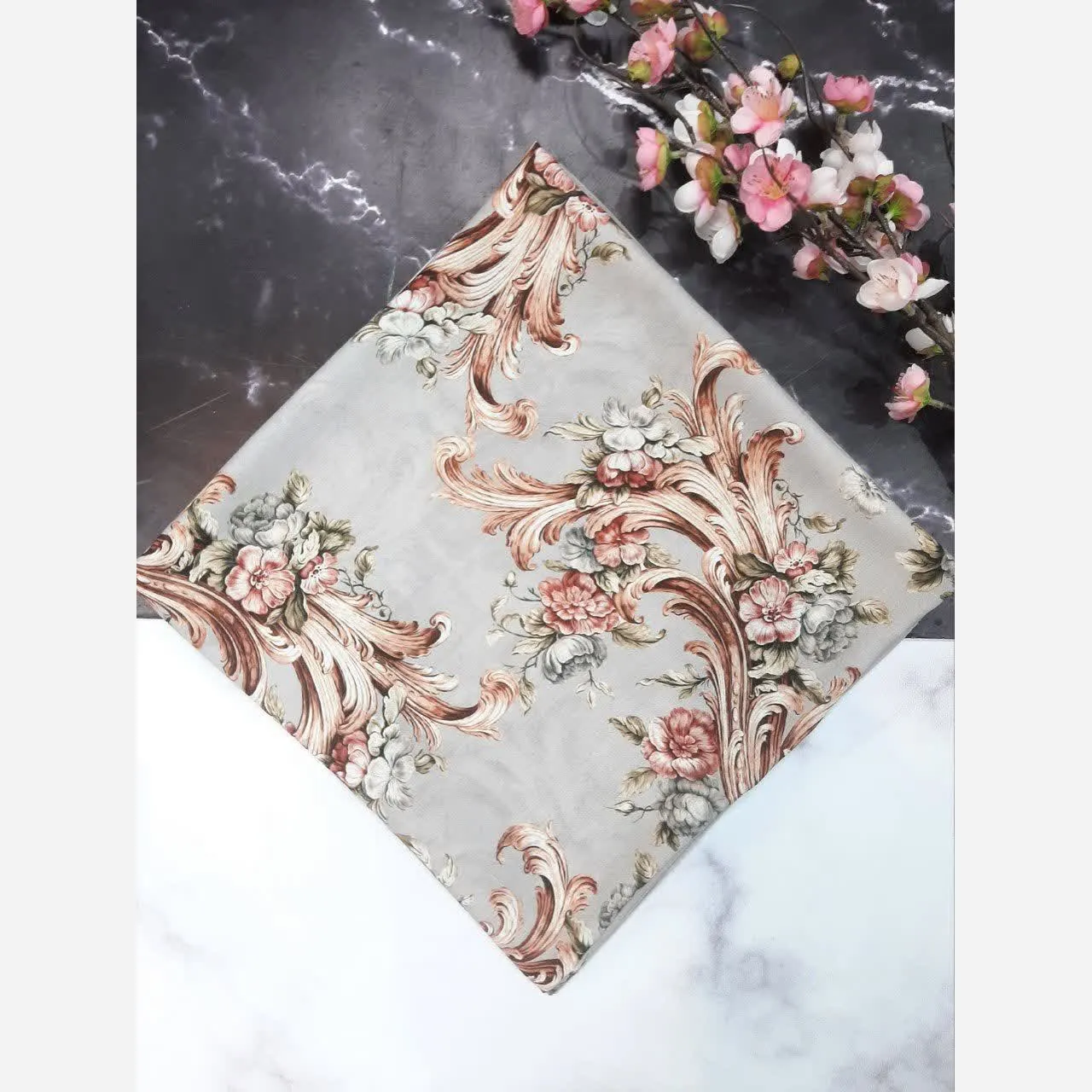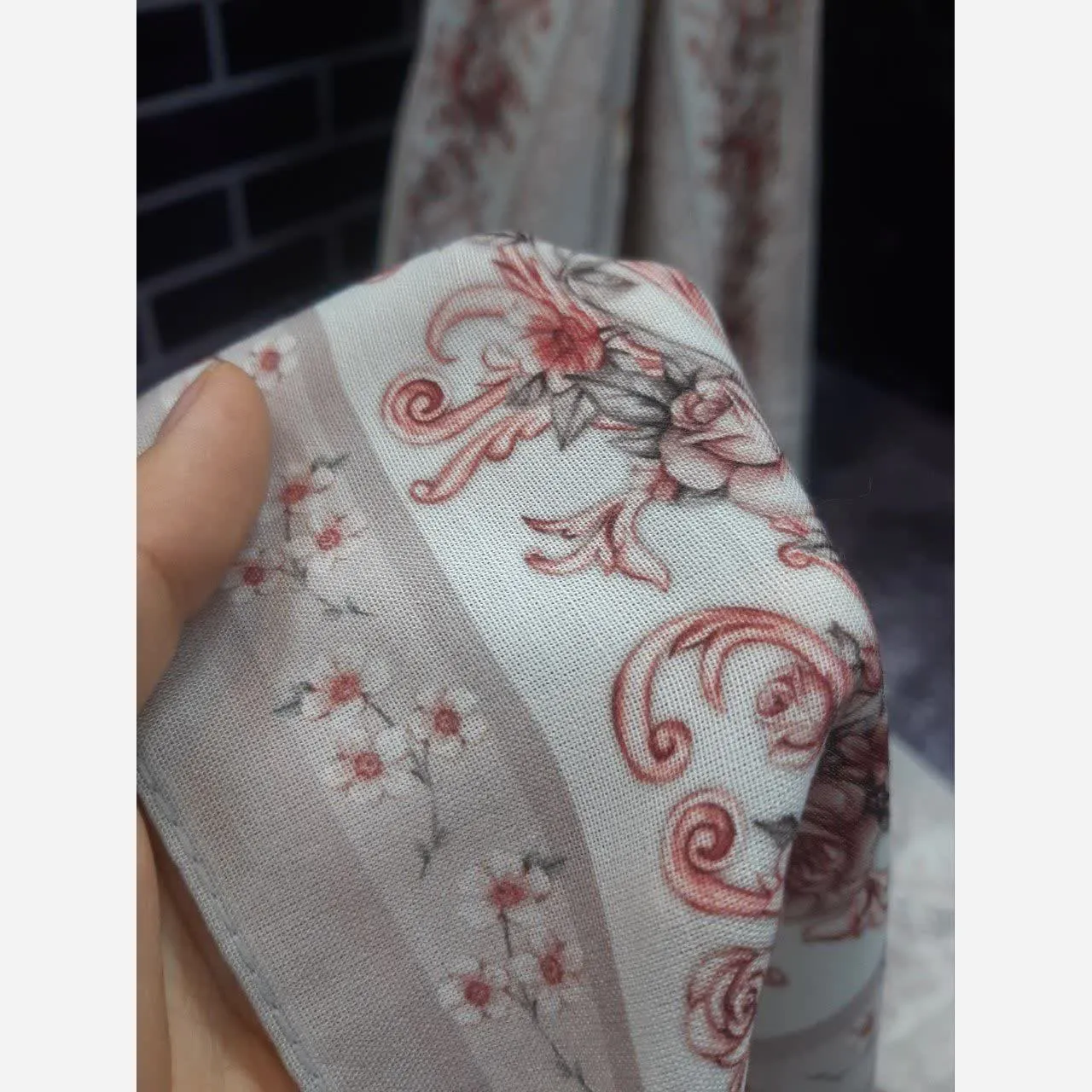 با طرح زیبای حنا و حاشیهای که با شکوفههای ریز و دوستداشتنی ترکیب شده، نگاهها را به خود جلب کنید. رنگ طوسی این روسری، آن را به گزینهای فوقالعاده کاربردی برای ست کردن با انواع لباسها تبدیل کرده است. ✨🤍